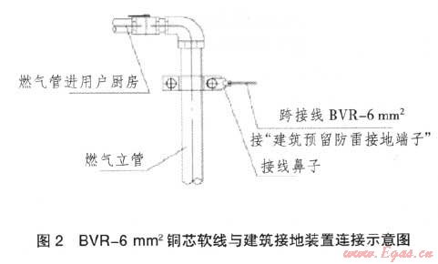 a)對(duì)于采用無(wú)縫鋼管的立管,當(dāng)立管高度不大于30m時(shí),燃?xì)饬⒐艿捻敹艘擞?/span>BVR-6mm2銅芯軟線與建筑接地裝置相連,具體做法見(jiàn)圖2。底端與燃?xì)庖牍荛y門(mén)連接處用BVR-6mm2銅芯軟線跨接,跨接電阻不大于0.03Ω。對(duì)于燃?xì)饬⒐芨叨葹?/span>30m以上的建筑,需從30m開(kāi)始,每隔不大于6m(一般為兩層)與建筑預(yù)留的防雷接地端子相連一處,做法與立管頂端的防雷接地做法相同;b)對(duì)于采用鍍鋅鋼管絲扣連接的立管,因各連接口采用聚四氟乙烯生料帶做密封材料,造成立管連接口不導(dǎo)通,各接口處須用BVR-6mm2銅芯軟線跨接,具體做法見(jiàn)圖3?,F(xiàn)有一種新型密封膠,導(dǎo)電性能良好,可作為立管絲扣連接的密封材料,現(xiàn)正在研發(fā),若能推廣應(yīng)用,各接口處就無(wú)需再做跨接了。