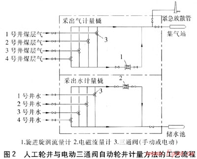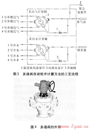 優(yōu)點:利用電動三通閥,可實現(xiàn)對各單井計量的自動切換,減少了人工切換的工作量;任何一口單井發(fā)生故障,都不會影響到其他井的排采。缺點:井數(shù)越多,可連續(xù)計量的時間越短;受供電系統(tǒng)影響較大,若供電系統(tǒng)發(fā)生故障,將無法實現(xiàn)自動輪井計量;造價較高。造價:采出氣計量橇約9.5×104元.采出水計量橇約8.3×104元。