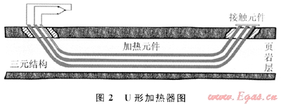 不同于Y形加熱器的位列方向,U形加熱器將3個(gè)加熱器在地面上以三角形方式水平排列(圖2)。該加熱器利用了較長(zhǎng)的、大體上水平的加熱器支腿長(zhǎng)度,可用來開采較薄層的油頁巖礦層,缺點(diǎn)是鉆多個(gè)水平井和斜向井,成本較高,不容易實(shí)施。