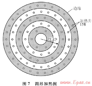 圖7為加熱井的另外一種陣列形式。在同心環(huán)形式的體積中,隨著環(huán)形體積向外移動(dòng)其周長(zhǎng)逐漸增大。所以間插加熱可減少外環(huán)體積的地層熱膨脹。