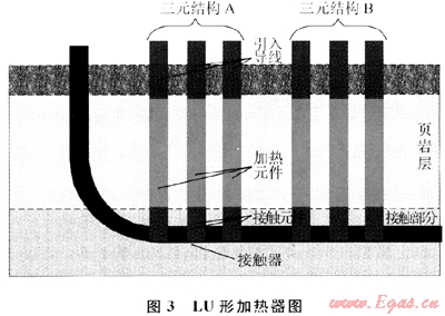 為了降低加熱器的成本,LU形加熱器沿直線方向布置3個(gè)加熱器(圖3)。