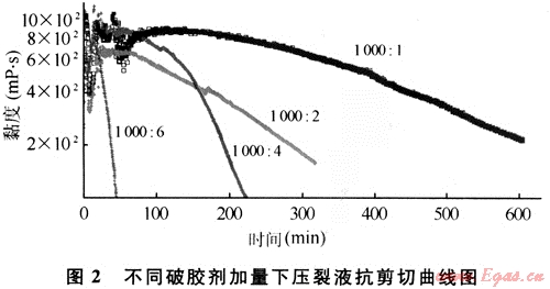 針對(duì)大規(guī)模加砂壓裂對(duì)壓裂液的要求,重點(diǎn)評(píng)價(jià)了壓裂液的抗長剪切能力和徹底破膠性能。