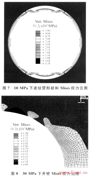 4) 井壁只在波紋管與其最先接觸的點(diǎn)以及隨后接觸的波峰頂點(diǎn)處會(huì)出現(xiàn)較高的Mises應(yīng)力。