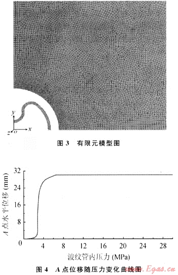 根據(jù)彈塑性理論,假設(shè)波紋管和井壁無(wú)限長(zhǎng),在管內(nèi)施加壓力載荷時(shí),可以簡(jiǎn)化為平面應(yīng)變問(wèn)題,即可以從波紋管和井壁上截取一個(gè)截面進(jìn)行分析。同時(shí),由于波紋管和井壁是沿軸對(duì)稱的幾何形體,因此,可以取波紋管和井壁截面的1/4進(jìn)行分析解算。劃分網(wǎng)格后的模型(1/4放大,由于比例原因,部分模型被截取)如圖3所示。為了更接近模擬井底狀況,盡可能地降低尺寸參數(shù)對(duì)模擬結(jié)果的影響,井壁尺寸取波紋管尺寸的5倍,并在內(nèi)壁接觸區(qū)域進(jìn)行網(wǎng)格細(xì)化[6~7](波紋管內(nèi)壓力變化曲線如圖4)。波紋管和井壁的摩擦系數(shù)設(shè)為0.15[6],即認(rèn)為波紋管在井壁中自由膨脹,井壁對(duì)其起徑向約束作用的同時(shí),在周向會(huì)和其外壁發(fā)生摩擦。在解算過(guò)程中,不能通過(guò)求解單一系統(tǒng)的方程計(jì)算求解,而是增量地施加給定的載荷并求解,逐步獲得最終的解答。因此,將模擬劃分為一定數(shù)量的載荷增量步,并在每個(gè)載荷增量步結(jié)束時(shí)尋求近似的平衡構(gòu)形。而對(duì)于一個(gè)給定的載荷增量步,通常需要采取若干次迭代才能確定一個(gè)可接受的解,所有這些增量響應(yīng)的總和就是非線性分析的近似解[2]。所以求解方法組合了增量和迭代過(guò)程,應(yīng)用Newton-Raphson算法獲得平衡收斂,并使用較小的初始載荷步和最大載荷步,以加速收斂過(guò)程。