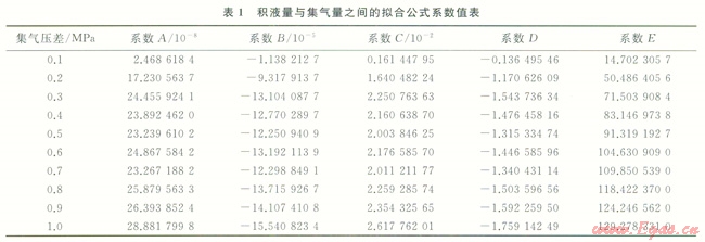 由圖2可見(jiàn),給定集氣量下,集氣壓差越大,積液量越大,在相同集氣壓差下,集氣量越大,積液量越小,因?yàn)檩敋饬吭酱?,摩擦損失越大,由積液導(dǎo)致的壓損越小,根據(jù)模擬分析,擬合出積液量與集氣量和集氣壓差之間的關(guān)系式。