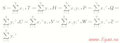 式中N為參與擬合計(jì)算的特征點(diǎn)的個(gè)數(shù),其他參數(shù)計(jì)算式如下: