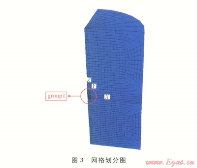 圖3中,1/4圓柱體模擬儲氣庫溶腔周圍的地質(zhì)環(huán)境,其直徑是儲氣庫溶腔模型最大直徑的20倍,在網(wǎng)格中間位置可以看到儲氣庫溶腔輪廓的1/4。在網(wǎng)格劃分時(shí)將儲氣庫溶腔網(wǎng)格一起劃分,有助于儲氣庫溶腔的形成。在此網(wǎng)格中,定義了2個(gè)組,分別是group1和group2,前者對儲氣庫溶腔進(jìn)行網(wǎng)格劃分,后者對儲氣庫溶腔周圍地質(zhì)環(huán)境進(jìn)行網(wǎng)格劃分。選擇采用各向同性彈性模型,其材料特性常數(shù)見表1。
