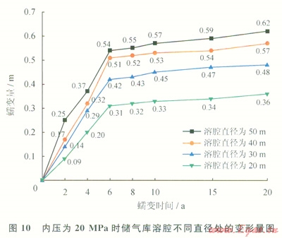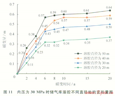 對比分析圖9~11,可以得出:①溶腔不同直徑處變形量隨時(shí)間變化規(guī)律比較一致,溶腔直徑為50m處的變形量最大;②蠕變時(shí)間為6a時(shí),不同壓力下溶腔不同直徑處變形量曲線均出現(xiàn)一個(gè)明顯的轉(zhuǎn)折點(diǎn)。蠕變時(shí)間小于6a時(shí),溶腔變形量曲線斜率較大,表明在此時(shí)間內(nèi)溶腔變形速率較大,變形比較顯著;蠕變時(shí)間大于6a時(shí),溶腔變形量曲線較平緩,溶腔變形量隨時(shí)間變化不大;③內(nèi)壓為10MPa時(shí),蠕變20a后,溶腔直徑為50m處變形量為360mm。內(nèi)壓為20MPa時(shí),蠕變20a后,溶腔直徑為50m處變形量為620mm。內(nèi)壓為30MPa時(shí),蠕變20a后,溶腔直徑為50m處變形量為640mm。數(shù)據(jù)表明,溶腔內(nèi)壓小于20MPa時(shí),溶腔變形量隨壓力增大顯著增加;溶腔內(nèi)壓大于20MPa時(shí),溶腔變形量變化不大。