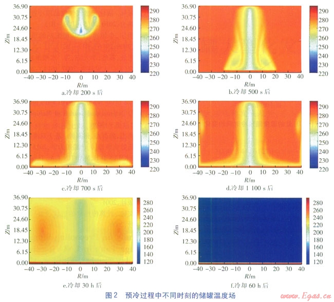 計(jì)算儲(chǔ)罐溫度場(chǎng)隨著時(shí)間的變化,儲(chǔ)罐溫度降至-150℃左右計(jì)算終止。預(yù)冷過(guò)程中不同時(shí)刻的儲(chǔ)罐溫度場(chǎng)見(jiàn)圖2,圖2中溫度單位均為K。