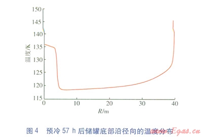 點(diǎn)(0,0)處的溫度隨預(yù)冷時(shí)間的變化見(jiàn)圖3,預(yù)冷57h后儲(chǔ)罐底部沿徑向的溫度分布見(jiàn)圖4。從圖3可以看出,儲(chǔ)罐底部中心(即點(diǎn)(0,0)處)的溫度并不是隨著預(yù)冷過(guò)程的進(jìn)行而一直降低的,當(dāng)儲(chǔ)罐底部溫度降低到一定程度后,底部中心出現(xiàn)了溫度不降反升的現(xiàn)象。從圖4也可以看出,底部中心區(qū)域的溫度高于其他位置(除靠近側(cè)壁處)。這是因?yàn)閲娏艿囊旱蔚竭_(dá)儲(chǔ)罐底面后,在底面氣化,產(chǎn)生的氣體無(wú)法及時(shí)沿底面向四周擴(kuò)散,積聚在儲(chǔ)罐底部的中心區(qū)域,形成二次回流,二次回流阻礙了儲(chǔ)罐底面與內(nèi)部低溫氣體的對(duì)流換熱。同時(shí),底部的混凝土向內(nèi)部的導(dǎo)熱還在繼續(xù),因此在二次回流區(qū)出現(xiàn)了溫度不降反升的現(xiàn)象。隨著預(yù)冷的繼續(xù),底部混凝土的熱量充分釋放,液滴在儲(chǔ)罐底面處的氣化量減小,產(chǎn)生的新氣體量減少,二次回流區(qū)逐漸被壓縮,底部中心區(qū)域的溫度又重新下降。