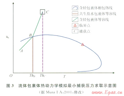 目前古流體壓力值測定方法有多種[8-18],筆者結合本地區(qū)油氣成藏的地質條件,采用流體包裹體PVT模擬法來計算古流體壓力值。如圖3中,ABC線為烴類包裹體或含烴鹽水包裹體等容線,AB段為氣液兩相共存,到B點均一為液相;ThB為含烴鹽水或烴類流體包裹體均一溫度,ThC為同期鹽水包裹體均一溫度。