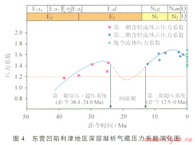 利津地區(qū)凝析氣藏古壓力系數(shù)隨時間演化的關系表明(圖4):