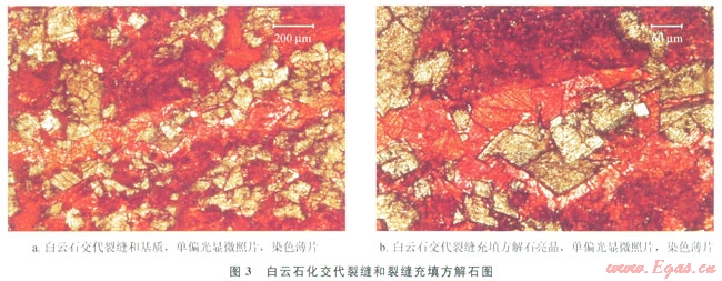 白云石化不僅與縫合線關系密切,而且在礁自云巖中還可見白云石交代構造裂縫和充填裂縫的亮晶方解石。圖3為染色薄片顯微照片,可清楚地看出有構造裂縫和裂縫充填的亮晶方解石,白云石覆蓋在構造裂縫上,也覆蓋在裂縫充填的亮晶方解石上。白云石對裂縫和裂縫充填亮晶方解石的交代現(xiàn)象十分明顯。