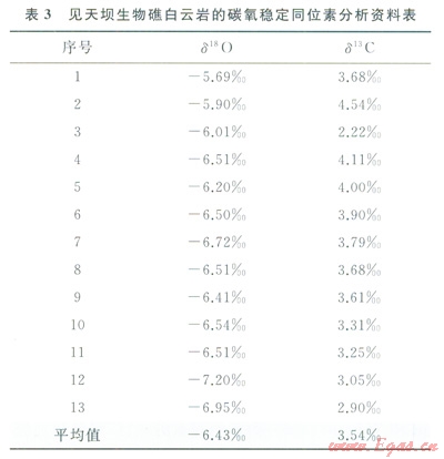 見天壩生物礁白云巖的碳氧穩(wěn)定同位素分析資料見表3。可以看出,礁白云巖的穩(wěn)定同位素值(PI)B標準,下同)為d18O=5.69‰~-7.20‰;d13C=+2.22‰~+4.54‰;平均值分別是-6.43‰(d18O)和+3.54‰(d13C)。要正確了解礁白云巖的這些穩(wěn)定同位素值在白云石化作用中的含義,還需要把其放在海水的穩(wěn)定同位素值中進行對比,因為海水的穩(wěn)定同位素碳和氧值是白云石成因解釋的基礎(圖7)。