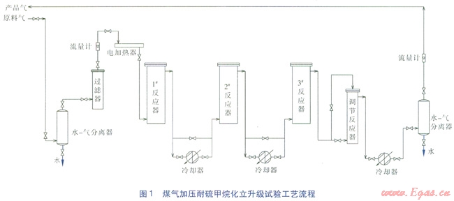 煤氣加壓耐硫甲烷化立升級試驗的工藝流程見圖1。原料氣直接從煤氣生產系統(tǒng)中引取,原料氣中H2S含量為40~60mg/L,總硫含量約為250~300mg/L。原料氣(冷煤氣)依次通過水—氣分離器(分離掉水分)和過濾器,經流量計計量后,經電加熱器加熱后進入1#反應器參加反應。從1#反應器出來的熱煤氣可直接進入2#反應器參加反應,當催化劑床層熱點溫度大于650℃時,從1#反應器出來的熱煤氣經冷卻器冷卻后再進入2#反應器參加反應。從2#反應器出來的熱煤氣可直接進入3#反應器參加反應,當催化劑床層熱點溫度大于650℃時,從2#反應器出來的熱煤氣經冷卻器冷卻后再進入3#反應器參加反應。從3#反應器出來的熱煤氣進入調節(jié)反應器(如果催化劑性能尚可,則從3#反應器出來的熱煤氣從頂部進入調節(jié)反應器,隨即離開,不參加反應;如果催化劑性能不好,則從3#反應器出來的熱煤氣從下部進入調節(jié)反應器,熱煤氣參加反應),從調節(jié)反應器出來的熱煤氣經過冷卻器后進入水—氣分離器,經水—氣分離器分離掉水分后,再經流量計計量得到產品氣。
