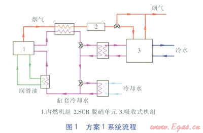 方案1系統(tǒng)流程見圖1。內(nèi)燃機組煙氣經(jīng)煙氣—水換熱器后進入SCR脫硝單元,脫硝后進入煙氣熱水型溴化鋰吸收式冷水機組(以下簡稱吸收式機組),放熱后與過剩煙氣一同排放。缸套冷卻水分別經(jīng)兩級換熱器降溫后,再吸收潤滑油部分熱量,最終回到內(nèi)燃機組缸套。