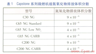 微燃機組的基本工作原理是空氣經(jīng)壓縮機增壓后與天然氣在燃燒室內(nèi)燃燒,產(chǎn)生的高溫高壓煙氣推動透平做功帶動發(fā)電機發(fā)電。作為最早研發(fā)也是目前最成功的微燃機組之一——Capstone系列微燃機組,集透平、高效回熱器、空氣軸承、高速永磁發(fā)電、超低排放、高度集成的數(shù)字電力轉(zhuǎn)換技術(shù)于一體。該系列微燃機組只有一個運動部件,結(jié)構(gòu)緊湊,采用空氣冷卻,無需潤滑油及冷卻液,運行維護費用低,燃料適應性強,可實現(xiàn)模塊化組裝,煙氣余熱具有較高的利用價值。由于采用稀薄燃燒技術(shù),使得氮氧化物排放體積分數(shù)低于9×10-6,可滿足嚴格的環(huán)保要求,無需進行脫硝處理。Capstone系列微燃機組氮氧化物排放體積分數(shù)見表1。