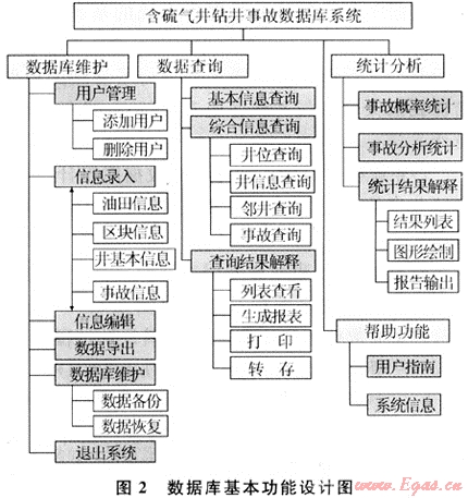 鉆井事故數(shù)據(jù)庫系統(tǒng)主要有如下5大功能模塊:①數(shù)據(jù)管理:完整的數(shù)據(jù)錄入、編輯、刪除等操作。數(shù)據(jù)庫管理設(shè)計(jì)的關(guān)鍵問題是如何避免記錄重復(fù)添加、規(guī)范數(shù)據(jù)的輸入格式以及一定的容錯(cuò)性。a.避免記錄重復(fù),新數(shù)據(jù)與數(shù)據(jù)庫內(nèi)原有記錄不能完全相同。若新輸入的數(shù)據(jù)在數(shù)據(jù)庫中已存在給出提示。b.數(shù)據(jù)庫格式規(guī)范化,數(shù)據(jù)庫對(duì)于所輸入的數(shù)據(jù)必須經(jīng)過一定的后臺(tái)處理后,才能存儲(chǔ)到數(shù)據(jù)庫文件中。為了保證數(shù)據(jù)存儲(chǔ)的準(zhǔn)確性,該數(shù)據(jù)庫系統(tǒng)對(duì)所輸入數(shù)據(jù)的格式進(jìn)行了規(guī)定。c.容錯(cuò)性,若對(duì)每一個(gè)數(shù)據(jù)項(xiàng)都進(jìn)行嚴(yán)格的規(guī)定,這無疑會(huì)引起數(shù)據(jù)錄入人員的反感,對(duì)數(shù)據(jù)錄入人員的技術(shù)水平也提出更高的要求,有些字段沒有必要進(jìn)行嚴(yán)格的格式限制。因此,充分利用Visual Basic內(nèi)部的字符轉(zhuǎn)化程序,有些字段沒有進(jìn)行格式限制,從而保證系統(tǒng)有一定的容錯(cuò)性。d.數(shù)據(jù)的完整性,在數(shù)據(jù)編輯過程中所要考慮的首要問題是數(shù)據(jù)庫采用關(guān)系型數(shù)據(jù)庫,同一字段會(huì)在多個(gè)表中出現(xiàn),在數(shù)據(jù)的修改、刪除操作時(shí),須保證數(shù)據(jù)庫的整體完整性。②數(shù)據(jù)庫備份與恢復(fù):對(duì)現(xiàn)有的數(shù)據(jù)庫內(nèi)數(shù)據(jù)定期進(jìn)行數(shù)據(jù)備份,防止由于系統(tǒng)問題或誤操作造成的數(shù)據(jù)丟失。a.備份文件名稱命名規(guī)則“database”+“備份的日期”(例如2008年5月29日備份的文件名:database20080529.mdb)。b.系統(tǒng)恢復(fù)功能,當(dāng)數(shù)據(jù)庫內(nèi)部數(shù)據(jù)出現(xiàn)錯(cuò)誤或者誤操作引起數(shù)據(jù)丟失時(shí),利用先前備份的數(shù)據(jù)庫文件,將數(shù)據(jù)庫恢復(fù)到指定日期。③查詢功能:數(shù)據(jù)庫的查詢功能是數(shù)據(jù)庫的核心功能,該數(shù)據(jù)庫系統(tǒng)共設(shè)計(jì)有5種查詢。a.數(shù)據(jù)導(dǎo)航式查詢,將數(shù)據(jù)庫系統(tǒng)所存儲(chǔ)數(shù)據(jù)以樹形結(jié)構(gòu)進(jìn)行顯示,以方便使用者查詢。數(shù)據(jù)導(dǎo)航式查詢采用“油氣田→區(qū)塊→井→事故”四級(jí)導(dǎo)航模式數(shù)據(jù)庫。b.區(qū)塊井位查詢,輸入?yún)^(qū)塊/井名稱查詢井位,有信息則在窗體右邊區(qū)域顯示,若沒有信息則給出數(shù)據(jù)庫中無信息的提示,在顯示區(qū)域可提前設(shè)定顯示比例。c.井的基本信息查詢,多種條件下的復(fù)合檢索,最多支持3個(gè)查詢條件。根據(jù)查詢條件的邏輯關(guān)系,在“邏輯關(guān)系”列表框中選擇“并且、或者”。d.鄰井查詢,以井口坐標(biāo)為依據(jù)查詢鄰井,可以自定義查找半徑。e.事故查詢,事故地質(zhì)、鉆井工藝、鉆井液性能、井口設(shè)備以及事故特征參數(shù)查詢。④統(tǒng)計(jì)功能,利用標(biāo)準(zhǔn)SQL語句可以對(duì)數(shù)據(jù)庫中的數(shù)據(jù)進(jìn)行統(tǒng)計(jì)、求和等,然后利用Visual Basic中的Ms-chart控件實(shí)現(xiàn)統(tǒng)計(jì)結(jié)果的繪圖功能。⑤數(shù)據(jù)導(dǎo)出功能:根據(jù)用戶需要將特定的信息從數(shù)據(jù)庫導(dǎo)出到word或者excel文本中。⑥自動(dòng)報(bào)表功能:根據(jù)數(shù)據(jù)庫所存數(shù)據(jù),按照油氣田標(biāo)準(zhǔn)格式打印用戶指定信息。