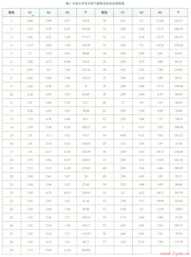 根據(jù)風險評估方法,計算出烏魯木齊市57條滅然氣管道的風險值(表2)。由表2可知,管網脆弱性指標以1號管線最大,為4.84,其次是51號管線,為4.70,主要是因為管線管輸氣體壓力大,管線使用年限較長,19號管線管輸氣體壓力小,最小埋深大管網脆弱性指標最小,為2.23。事故誘因指標以57號管線最大,為6.32,其次是51號管線,為6.22,主要是因為建筑施工、地面活動情況和供水、排水沒施建設活動較頻繁,15號管線位于郊區(qū),外界干擾少,事故誘因指標最小,為2.63。事故后果指標以3,號管線最大,為14.32,其次是38號管線,為13.33,主要是因為燃氣管網位于居住區(qū)、商業(yè)區(qū)內,人口密度和財產密度較高,泄漏危害嚴重;41號管線位于人煙稀少地區(qū),事故后果指標最小,為0.94。全部管網風險平均值為112,1條天然氣管道風險評估值大于300,說明有較高的風險;2條天然氣管道風險評估值在200~300之間,說明風險一般;54條天然氣管道風險值小于200,說明相對安全。綜合以上,由于管道周圍運行環(huán)境不同,其風險也是不一樣的,51號管段的脆弱性指標、事故誘因指標和事故后果指標較大,知此管段的風險等級較高。