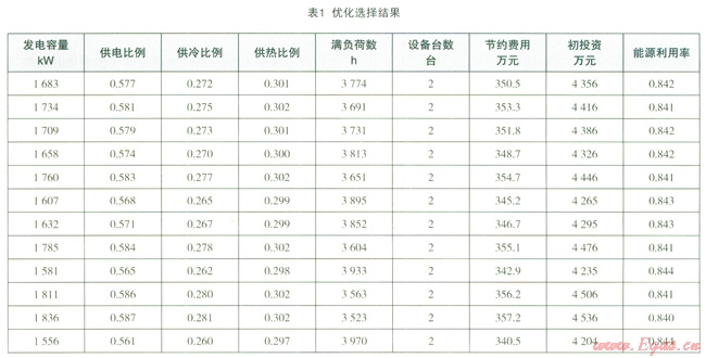 以10萬m2酒店建筑為例,采用分布式能源系統(tǒng)優(yōu)化計算軟件,綜合考慮能源利用效率、節(jié)約運行費用、初投資、機組滿負(fù)荷時數(shù)等因素后,得到的不同發(fā)電容量下的方案排序如表1所示。