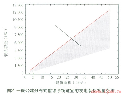 在實際項目實施中,如果沒有足夠資料對供能對象做詳細(xì)的負(fù)荷分析,可結(jié)合相關(guān)技術(shù)規(guī)定及已有項目運行經(jīng)驗簡單確定發(fā)電機組的容量。對于一般公共建筑,可根據(jù)其功能特點,按照設(shè)計電負(fù)荷的20%~50%選擇發(fā)電機組容量,全年負(fù)荷較為穩(wěn)定的建筑取上限,負(fù)荷波動較大的建筑取下限,如圖l所示。