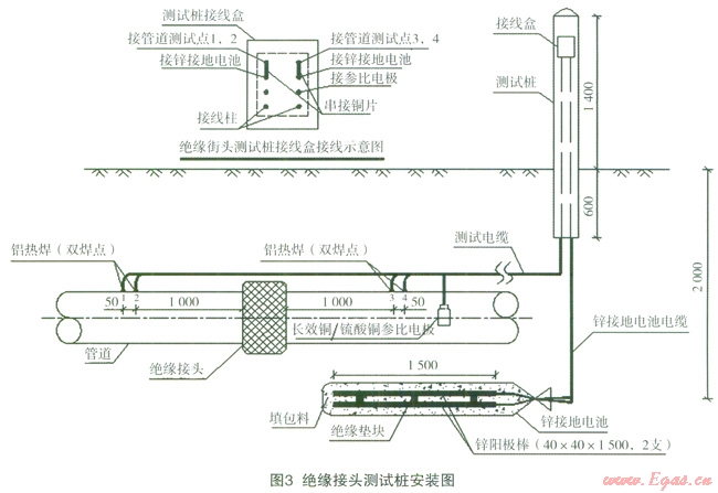 工藝專業(yè)一般都在加氣站、門站、調(diào)壓站等場站的進出站管道上設有絕緣接頭。絕緣接頭的功能主要有兩個,一是將陰極保護電流限制在站外管道上,防止陰極保護電流通過站內(nèi)工藝裝置的接地系統(tǒng)流失,二是將站內(nèi)設備的雜散電流隔絕在站內(nèi),防止雜散電流流到站外長輸管道或者城市管網(wǎng)上造成雜散電流干擾腐蝕。但絕緣接頭只能作為隔絕管道陰極保護電流及站內(nèi)雜散電流用,而不能作為過電壓的安全防護措施用,站內(nèi)及管道上因雷擊產(chǎn)生的高電壓、站內(nèi)設備故障產(chǎn)生的高電壓、管道上因氣流摩擦而產(chǎn)生的靜電、長輸管道的感應過電壓等都會將絕緣接頭損壞。絕緣接頭一旦損壞就會對長輸管道或者城市管網(wǎng)的陰極保護系統(tǒng)造成嚴重影響,甚至使陰極保護系統(tǒng)失效,所以必須為絕緣接頭添加防護措施。絕緣接頭的防護裝置主要有避雷器、電解接地電池、極化電池及二極管保護器,目前應用最廣泛的是接地電池。接地電池是用來提供一個低電阻通道,排放強電電涌但不泄漏陰極保護直流電流的一種裝置,通常采用鋅材料制作[1]。