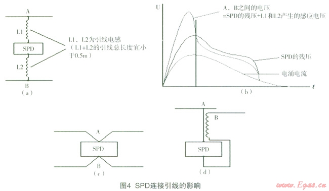 在各級配電柜/箱及信息系統(tǒng)線路上安裝相應級別的電涌保護器(SPD),以把雷電流及電氣系統(tǒng)故障電流盡可能地泄入大地,保護用電設備的安全。為使SPD安裝處呈現(xiàn)的最大電涌電壓足夠低,SPD兩端的引線應做到最短(兩端引線總長度不宜大于0.5m),并且要避免形成過大環(huán)路,以獲得最佳保護效果。當引線較長而產(chǎn)生的引線寄生感應電壓較大時,可采用圖4中(c)、(d)的接線,以轉(zhuǎn)移和補償引線的寄生電感,從而改善保護電路的性能[2]。