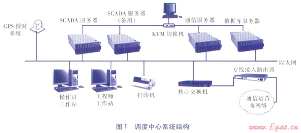調(diào)度中心是整個SCADA系統(tǒng)的調(diào)度指揮中心,操作人員在調(diào)度指揮中心通過計算機系統(tǒng)即可完成對整個城市燃?xì)廨斉涔芫W(wǎng)的監(jiān)控和運行管理等任務(wù)。調(diào)度指揮中心配置SCADA服務(wù)器、通信服務(wù)器、數(shù)據(jù)庫服務(wù)器、專線接入路由器、核心交換機、操作員工作站、工程師工作站等設(shè)備,并通過局域網(wǎng)相連,系統(tǒng)結(jié)構(gòu)見圖1。
