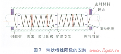 ②不可避免使用套管時(shí),可在套管內(nèi)部采取局部的陰極保護(hù)也是一種很有效的辦法。具體做法是:在套管內(nèi)的主管道上纏繞鎂陽(yáng)極帶或鋅陽(yáng)極帶或安裝鐲式陽(yáng)極[4]。當(dāng)主管道外防腐層為3PE防腐時(shí),推薦使用纏繞鎂陽(yáng)極帶的局部陰極保護(hù)。安裝鎂陽(yáng)極帶時(shí),可采用機(jī)械打磨的方法,露出里面的鋼管約3~5cm癌主管道上開鑿一個(gè)合適的焊點(diǎn),采用電焊、鋁熱焊等焊接方式把鎂陽(yáng)極帶一端焊接到主管道上,根據(jù)不同的管徑按照一定的角度和間距,貼著管道的外壁緊緊纏繞。針對(duì)不同管徑,鎂陽(yáng)極帶有不同的纏繞角度:當(dāng)燃?xì)夤艿劳鈴?le;219mm時(shí),鎂陽(yáng)極帶沿管道外壁等距且與管道軸向成30°角纏繞;當(dāng)燃?xì)夤艿劳鈴綖?span lang="EN-US">219~377mm時(shí),沿管道外壁等距且與管道軸向成45°角纏繞;當(dāng)燃?xì)夤艿劳鈴?ge;377mm時(shí),沿管道外壁等距且與管道軸向成600角纏繞[4]。鎂陽(yáng)極帶另一端也要和起點(diǎn)一樣,焊接在主管道上,而且兩個(gè)焊點(diǎn)都要做好絕緣防腐。鎂陽(yáng)極帶纏繞施工完畢,套管兩端應(yīng)采用柔性的防腐、防水材料密封,并保證密封良好,防止水或其他雜物的進(jìn)入。纏繞鎂陽(yáng)極帶法的優(yōu)點(diǎn)是施工簡(jiǎn)單方便,缺點(diǎn)是鎂的電位較負(fù),保護(hù)年限不是很長(zhǎng)[4]。帶狀犧牲陽(yáng)極的安裝見圖3。