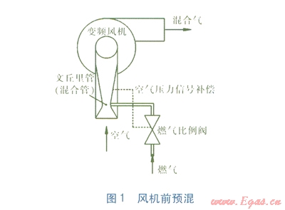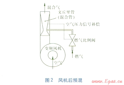 目前市場(chǎng)上的全預(yù)混冷凝式燃?xì)獗趻鞝t(以下簡(jiǎn)稱全預(yù)混壁掛爐)主要有風(fēng)機(jī)前預(yù)混、風(fēng)機(jī)后預(yù)混兩種,分別見(jiàn)圖l、2。變頻風(fēng)機(jī)、燃?xì)獗壤y[2-3]提供燃燒所需的空氣與燃?xì)?,空氣與燃?xì)獍丛O(shè)定好的空燃比進(jìn)行混合燃燒。