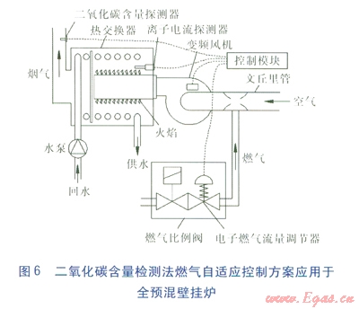 二氧化碳含量探測(cè)法燃?xì)庾赃m應(yīng)控制方案應(yīng)用于全預(yù)混壁掛爐見(jiàn)圖6。其控制原理為:二氧化碳含量探測(cè)器對(duì)煙氣中的二氧化碳含量進(jìn)行實(shí)時(shí)監(jiān)控,控制模塊接收二氧化碳含量探測(cè)器的信號(hào),對(duì)信號(hào)進(jìn)行邏輯分析。當(dāng)二氧化碳含量偏離設(shè)置值時(shí),控制模塊會(huì)迅速輸出電信號(hào)給電子燃?xì)饬髁空{(diào)節(jié)器及變頻風(fēng)機(jī),進(jìn)行控制參數(shù)調(diào)整,從而調(diào)整空燃比,使煙氣中的二氧化碳體積分?jǐn)?shù)恢復(fù)到9%左右。需要說(shuō)明的是二氧化碳含量檢測(cè)法燃?xì)庾赃m應(yīng)控制方案中也要有離子電流探測(cè)器,用以判斷火焰是否存在。