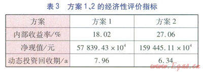 本文采用內(nèi)部收益率(稅前)、凈現(xiàn)值(稅前)、動態(tài)投資回收期(稅前)作為方案經(jīng)濟(jì)性評價指標(biāo)。內(nèi)部收益率的經(jīng)濟(jì)含義是項目在其壽命期內(nèi)未回收資金的預(yù)計收益率,項目投入運營后,投資額將通過每年所產(chǎn)生凈效益的形式逐步得到回收。已回收部分將用于再投資,未回收部分待繼續(xù)回收,內(nèi)部收益率就是指未回收部分的收益率,因此稱為內(nèi)部收益率。凈現(xiàn)值的經(jīng)濟(jì)含義是項目在其壽命期內(nèi)預(yù)計創(chuàng)造的全部凈效益。內(nèi)部收益率、凈現(xiàn)值都是反映項目贏利能力的指標(biāo),前者體現(xiàn)的是相對贏利能力,后者體現(xiàn)的是絕對贏利能力。內(nèi)部收益率、凈現(xiàn)值越大,項目贏利能力越強。動態(tài)回收期越短,說明項目收回投資額的時間越短。方案1、2的經(jīng)濟(jì)性評價指標(biāo)見表3。由表3可知,方案2的內(nèi)部收益率、凈現(xiàn)值均高于方案l,且方案2的動態(tài)投資回收期短于方案l,這說明方案2的經(jīng)濟(jì)性優(yōu)于方案l。
