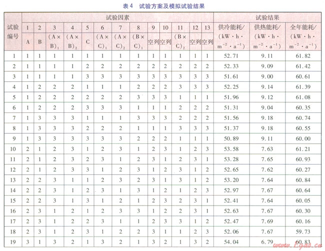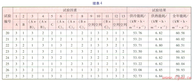 正交試驗的指標有供冷能耗、供熱能耗和全年能耗,其中全年能耗為供冷能耗和供熱能耗之和。正交試驗模擬結果見表4。