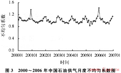 近幾年由于受國家經濟宏觀調控政策和城市環(huán)保要求提高等因素的影響,民用、發(fā)電等用氣增長較快,但民用和采暖用氣的季節(jié)性不均勻問題突出,冬季高月和夏季低月值相差很大。中國石油每年的1、2、3、10、11、12等6個月的不均勻系數(shù)偏大(不均勻系數(shù)為月產量與年均月產量的比值),最高為12月份,連續(xù)6a的12月不均勻系數(shù)都在1.2以上,2005年不均勻系數(shù)達到了1.54的高峰,峰谷差為1.3~1.5倍(圖3)[4~5]。