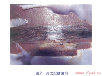 試件為一段長度為200mm的鋼管(材質(zhì)為Q235),對銹蝕測試段外壁進行拋光處理,拋光后測試段外直徑為73.8mm,壁厚為3.5m。試件中光纖的布置方式見圖l。在距鋼管端面50mm處纏繞光纖層(傳感段),纏繞時使光纖帶有一定的預(yù)應(yīng)力,保證光纖與鋼管表面緊密接觸,纏繞的光纖總長度在4m左右。將光纖用環(huán)氧樹脂膠固定在鋼管上,傳感段的引出端與帶保護套的傳輸光纜熔接,將熔接處進行保護處理,并在鋼管兩端的引出位置用環(huán)氧樹脂膠進行固定。光纖設(shè)置完畢后,在鋼管與PE保護管間進行發(fā)泡處理。