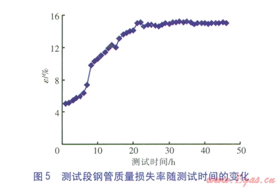 由測試結(jié)果可知,發(fā)生銹蝕前測試段外直徑D1為73.8mm,電化學(xué)加速銹蝕結(jié)束后測試段鋼管不包含銹蝕層的外直徑D1為72.8mm,代入式(2)可計算得到電化學(xué)加速銹蝕結(jié)束后測試段鋼管質(zhì)量損失率e為0.149,此時傳感段光纖的應(yīng)變?yōu)?span lang="EN-US">2161.0×10-6。由式(7)可計算得到,由銹蝕導(dǎo)致的測試段體積膨脹率h為l.16。設(shè)定在鋼管發(fā)生銹蝕后h保持不變,則可由布里淵分析儀讀取的傳感段光纖應(yīng)變及式(7)計算得到各時刻測試段鋼管質(zhì)量損失率。測試段鋼管質(zhì)量損失率隨測試時間的變化見圖5。