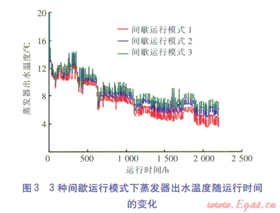 3種間歇運(yùn)行模式下蒸發(fā)器出水溫度隨運(yùn)行時(shí)間的變化見(jiàn)圖3。由圖3可知,3種間歇運(yùn)行模式下蒸發(fā)器出水溫度的下降幅度均小于連續(xù)運(yùn)行模式。對(duì)于間歇運(yùn)行模式l,蒸發(fā)器最低出水溫度為3.49℃,高于連續(xù)運(yùn)行模式,但仍然低于蒸發(fā)器出口溫度推薦范圍的下限,整個(gè)供暖期蒸發(fā)器出水溫度低于5℃的時(shí)間約260h。對(duì)于間歇運(yùn)行模式2,蒸發(fā)器最低出水溫度為4.95℃,高于間歇運(yùn)行模式l,而間歇運(yùn)行模式3的蒸發(fā)器最低出水溫度為5.86℃。因此,日開(kāi)停比越小,熱泵機(jī)組的運(yùn)行工況越好。