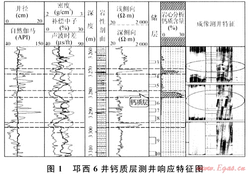 根據(jù)巖心觀察、薄片鑒定、實(shí)測(cè)巖心分析數(shù)據(jù)以及測(cè)井曲線和成像特征研究表明,方解石含量一般為5%~28%,鈣質(zhì)夾層巖性主要為長(zhǎng)石砂巖、巖屑砂巖和長(zhǎng)石巖屑砂巖,不穩(wěn)定礦物(長(zhǎng)石和巖屑)的含量與鈣質(zhì)含量具有一定的正相關(guān)關(guān)系。鈣質(zhì)夾層的電性特征表現(xiàn)為:低自然伽馬、低聲波時(shí)差和刺刀狀的高電阻率值特征;在成像測(cè)井表現(xiàn)的影像特征為呈亮帶狀分布(圖1)。