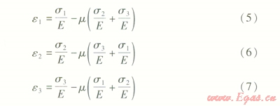 根據(jù)材料力學(xué)中三向應(yīng)力狀態(tài)下的廣義胡克定律[2]223有: