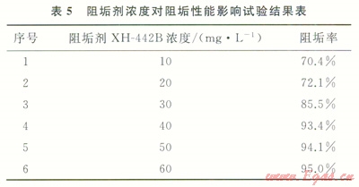 從表4可以看出,阻垢劑XH-442B在抑制硫酸鹽垢、碳酸鹽垢均能取得較好的效果。
