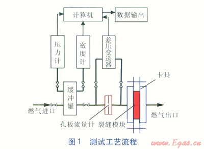 測(cè)試實(shí)驗(yàn)前,對(duì)測(cè)試實(shí)驗(yàn)整個(gè)系統(tǒng)進(jìn)行吹掃置換,使系統(tǒng)符合燃?xì)膺\(yùn)行條件。將低壓燃?xì)庖?span lang="EN-US">2m3緩沖罐中,燃?xì)膺M(jìn)入此緩沖罐靜置一段時(shí)間后,其溫度、壓力及密度處于相對(duì)穩(wěn)定狀態(tài)。測(cè)試開始后,由緩沖罐所連接的壓力計(jì)與密度計(jì)測(cè)量燃?xì)鈮毫εc密度,并將測(cè)量數(shù)據(jù)連續(xù)傳輸給計(jì)算機(jī)。計(jì)算機(jī)接收數(shù)據(jù)信號(hào)后,計(jì)算出未修正前的燃?xì)饬鹘?jīng)裂縫模塊的理論流量q0。同時(shí)燃?xì)饨?jīng)孔板流量計(jì)、卡具內(nèi)裂縫模塊流至室外大氣中。在此期間,孔板流量計(jì)兩側(cè)由燃?xì)鈱?dǎo)壓管相連接的差壓變送器同時(shí)獲取燃?xì)獠顗簲?shù)據(jù)信號(hào),并傳輸給計(jì)算機(jī),由計(jì)算機(jī)編程計(jì)算出此刻流經(jīng)裂縫模塊的燃?xì)庑孤?shí)際流量q0。最后計(jì)算機(jī)計(jì)算輸出燃?xì)饬髁啃拚禂?shù)K(K=qv/q0),完成整個(gè)測(cè)試實(shí)驗(yàn)。