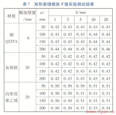 流量修正系數(shù)K的取值,主要取決于裂縫斷面形狀、管材。在實(shí)驗(yàn)室需制作相關(guān)模型分類測(cè)試計(jì)算。建立不同裂縫形狀及大小、不同板材及厚度的模塊,通過對(duì)各種模塊的測(cè)試分析計(jì)算,得出流量修正系數(shù)K的取值范圍。