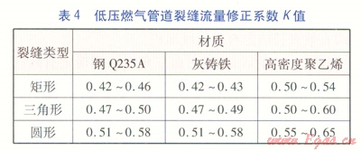 經(jīng)多次實(shí)驗(yàn)驗(yàn)證,在燃?xì)獾蛪汗鉅顩r下,改變?nèi)細(xì)獾膲毫?span lang="EN-US">(緩沖罐內(nèi)燃?xì)鈮毫?span lang="EN-US">),測(cè)試的K值不變,且K值受模塊壁厚影響甚微。由此得出管道裂縫流量修正系數(shù)K的取值范圍,見表4。
