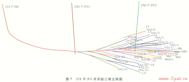 ZSl平-5H井是中國石油華北油田公司在山西沁水盆地的第1口煤層氣仿樹形水平井先導(dǎo)試驗。由1口工藝井(ZSl平-5H井)和1口排采直井(ZSl平-5H井)、1口監(jiān)測井(ZSl平-5H井)組成(圖7),工藝井主支設(shè)置在煤層頂板泥巖中,距煤層頂部保持適當(dāng)距離(一般控制在0.5~3m),不觸媒;排采井、監(jiān)測井在煤層頂板造洞穴,洞穴底部距離煤層1m,直徑0.6m,高度6m。