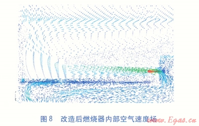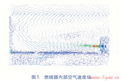 我們采取的優(yōu)化方案是在穩(wěn)壓室內(nèi)增設(shè)一個擋板,并對布風(fēng)板的開孔進(jìn)行重新布置。改造后的穩(wěn)壓室結(jié)構(gòu)及布風(fēng)板開孔位置分別見圖6、7。改造后,通過調(diào)節(jié)擋板位置可以獲得合理的一二次空氣量比例,保證一次空氣量能夠穩(wěn)定且不受燃燒過程的影響。二次風(fēng)由于處于一個楔形通道內(nèi),使得流動更容易均勻,消除穩(wěn)壓室內(nèi)的渦旋氣流的產(chǎn)生。改造后燃燒器內(nèi)部空氣速度場見圖8。