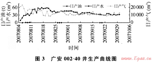 試氣試采產(chǎn)水量較高的井主要集中在須六段氣藏A區(qū)構(gòu)造北北東部和B區(qū),須四段氣藏部分區(qū)域。比如須六段氣藏A區(qū)構(gòu)造的廣安002-38、廣安002-43井的水氣比為2.577~3.169m3/104m3,而廣安002-40井的水氣比非常高(圖3),達31.47m3/104m3,廣安002-X45井只產(chǎn)水,不產(chǎn)油氣。B區(qū)107井的水氣比高達15.01m3/104m3,廣安111井的水氣比為4.187m3/104m3,興華1井的水氣比為9.306m3/104m3。