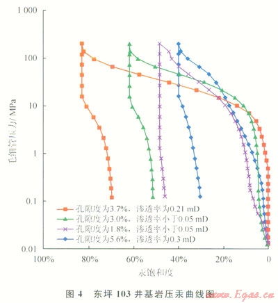 基巖儲層屬于雙重介質(zhì),29個巖樣的物性分析結(jié)果表明:基質(zhì)孔隙度介于1.2%~7.2%,平均為3.4%;滲透率介于0.054~0.91mD,平均為0.19mD,儲層致密。壓汞實驗結(jié)果表明:基質(zhì)排驅(qū)壓力在7MPa以上,部分樣品推測受裂縫影響,沒有平直段,排驅(qū)壓力較低(圖4);進(jìn)汞飽和度介于30%~80%。目前僅有4塊壓汞實驗樣品,實驗結(jié)果差異較大,也反映了基巖微觀非均質(zhì)性較強,其礦物溶孔和裂縫的分布差異較大。