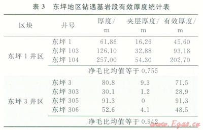 對于基巖塊狀氣藏,根據(jù)現(xiàn)有井測井響應(yīng)特征和取心資料,可以初步劃分出基巖井段內(nèi)的致密夾層,算出基巖段內(nèi)儲集層的有效厚度(表3)。