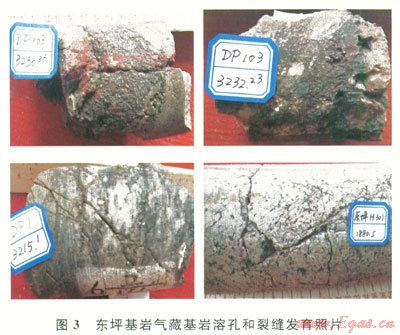1)東坪1井區(qū):主要以花崗片麻巖為主。從巖心上可觀察到高角度裂縫發(fā)育,裂縫寬度為1~2mm,裂縫發(fā)育程度好。東坪103井井深3200m靠近基巖風(fēng)化殼,可觀察到風(fēng)化溶蝕孔洞(圖3),但總體上發(fā)育較少。巖心裂縫十分發(fā)育,多數(shù)巖心呈碎塊狀態(tài)。
