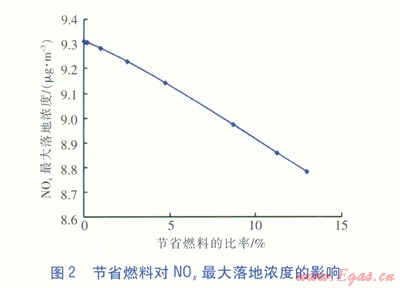 綜合分析正負(fù)兩方面因素,排煙溫度降低對NOx最大落地濃度的影響要比燃料的節(jié)省對NOx最大落地濃度的影響更為顯著,說明排煙溫度降低是主要影響因素,綜合起來NOx最大落地濃度是隨著煙氣溫度的降低逐漸增大的。